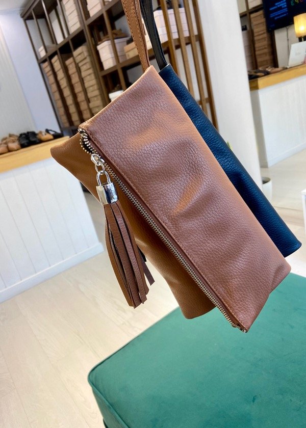 Sobre de cuero súper minimalista! Correa tipo muñequera, cierre YKK y forro de jersey. Un lujo